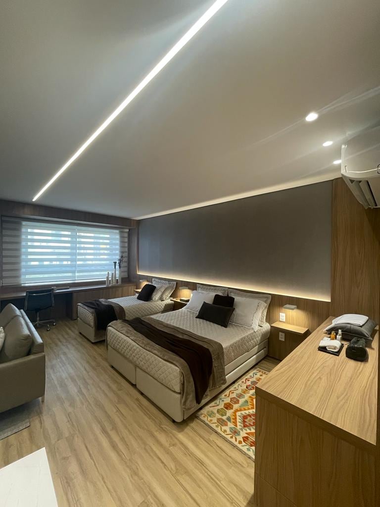 Loft luxueux, 54 m2, climatisation, table, cuisine équipée. Lave-linge et sèche-linge, machine Nespresso. Un espace intégré avec 1 lit queen super confortable et 1 lit simple avec 3 lits auxiliaires simples disponibles, armoire Linge de lit et de bain, sèche-cheveux Canapé en cuir, télévision intelligente 65’’ avec Internet. Établi avec chaise Espace extérieur commun : salle de sport , sauna, piscine chauffée, jacuzzi spa Loc. Centre commercial privilégié, Mater dei hôpitaux, felicio rocho ,Merc.central 1 place de parking et portier 24h/24. Luxe !
