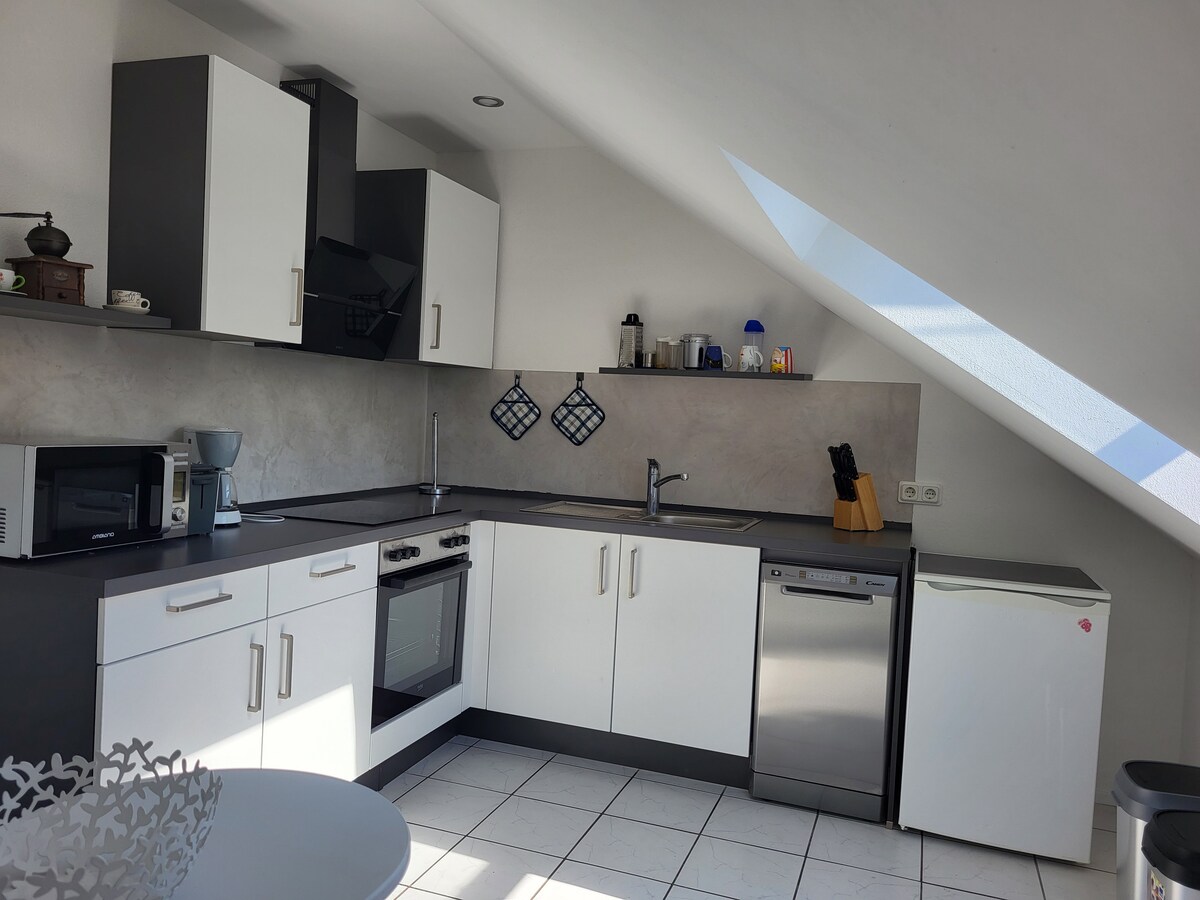 Appartement mansardé spacieux et ensoleillé avec une belle vue sur la verdure. Équipement haut de gamme, chauffage par le sol, excellente isolation, matériaux écologiques, sans parfum. Proximité directe de Limbourg/Diez, belles pistes cyclables et de randonnée dans les environs immédiats : par exemple, Lahnhöhenweg, Jakobsweg, Lahnradweg, Lahnwanderweg, Küppelweg, ... Mother Meera, Schaumburg, vieille ville et cathédrale de Limbourg, château de Diez, possibilités de baignade dans la piscine extérieure de Birlenbach et dans le lac de Baggersee Diez, canoë-kayak sur la Lahn et bien plus encore.