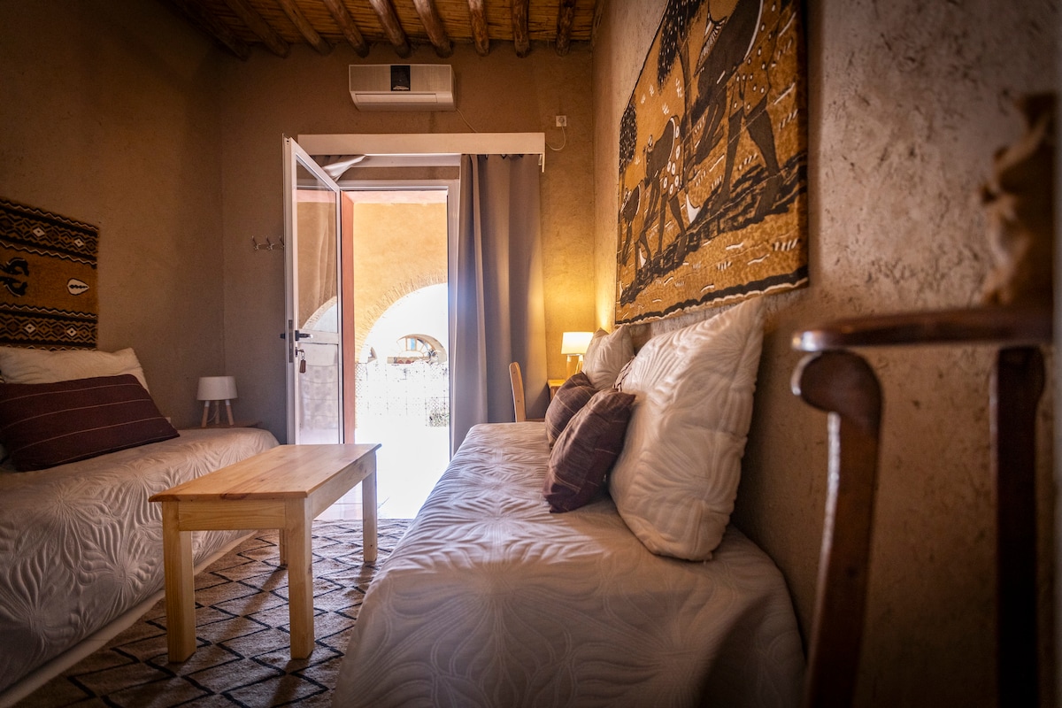 Plongez dans la paix d'une maison spacieuse. Loin du tourisme de masse, cet espace de sérénité vous offre, depuis sa terrasse, le spectacle inoubliable du lever du soleil sur les majestueuses dunes ! Vivez une expérience unique : en autonomie ou avec Hamid, votre hôte expert en bio-tourisme. Organisation des voyages immersifs sur mesure et une immersion complète dans la culture berbère et ses paysages (oasis, villages nomades). Idéal pour voyageurs en quête de paix et de traditions locales.