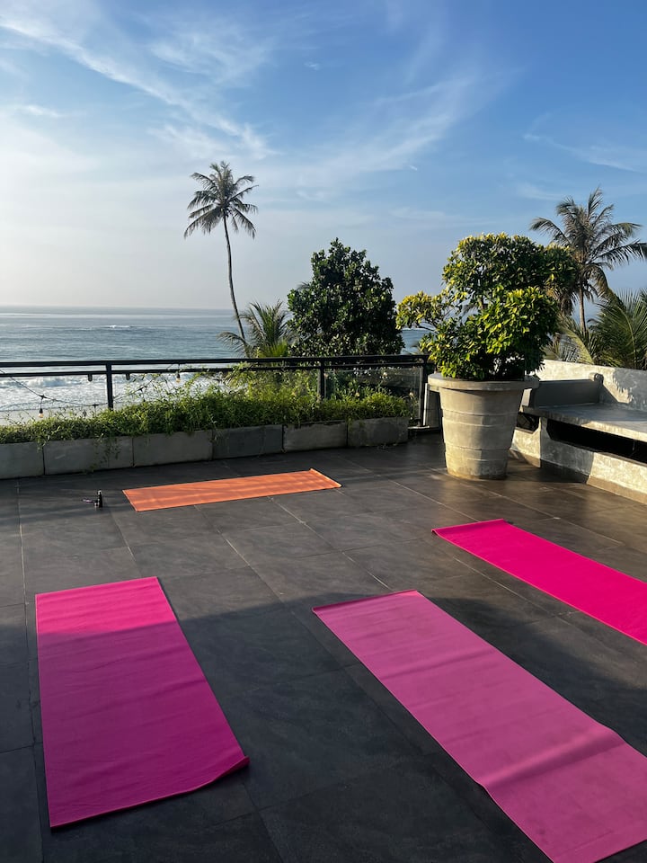 Yoga matinal sur un toit-terrasse au bord de l'océan à Hiriketiya