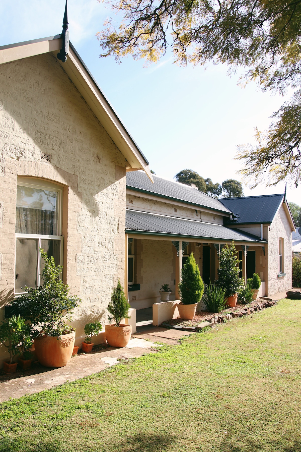 La maison d'Alex est située dans la ville de Laura, en Australie méridionale, dans les Flinders Ranges du sud. Construite au début des années 1900, cette gracieuse maison confortable a une atmosphère détendue avec des chambres généreuses, de hauts plafonds et des équipements modernes. Il est rempli de livres, d'œuvres d'art, de romans poubelle, de jeux de société et d'espaces pour les jouer ou regarder la télévision et se détendre devant le feu avec un verre de vin local.