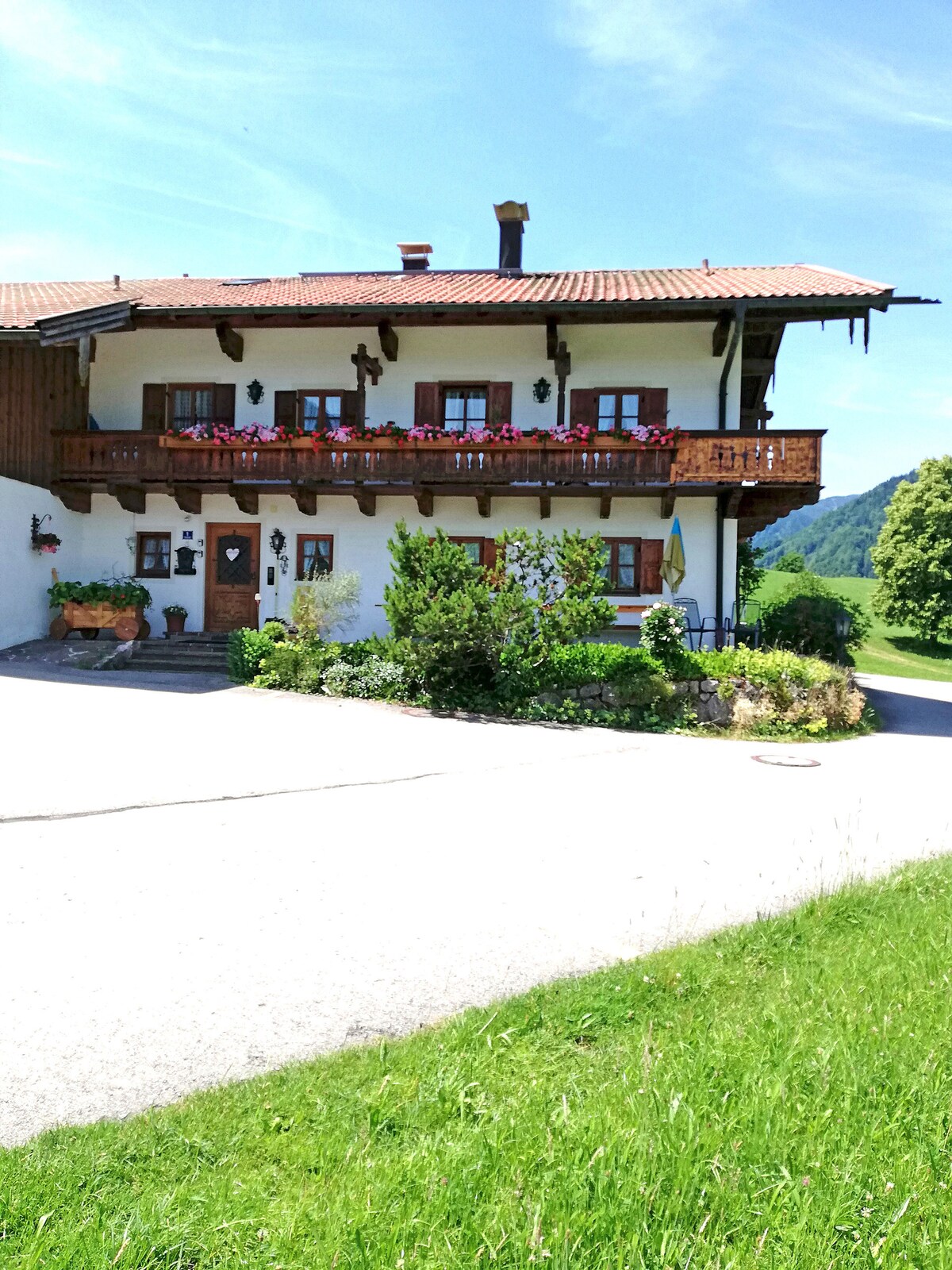 Aménagement chaleureux dans ferme historique, au calme dans petit village, au pied de la montagne, départ idéal pour des randonnées à pied ou à vélo ainsi que des excursions dans les alentours ou bien pour faire du ski de fond. Distances: 20 min Chiemsee, 25 min Bad Reichenhall, Traunstein, 35 min Salzburg, station de ski Reit im Winkl/Steinplatte, 45 min Berchtesgaden, Koenigsee, station de ski Lofer.