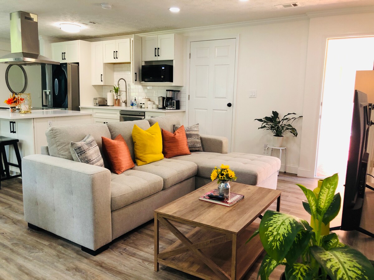 À 7 miles de la station-service au sud. Grande chambre d'invité dans une maison privée. Dispose d'une chambre de 240 pieds carrés avec lit King size, placard, bureau et télévision. 225 pieds carrés d'un salon magnifiquement meublé avec un canapé et un canapé-lit double, une table centrale et une télévision. Cuisine/salle à manger complète avec vaisselle, cuisinière avec four, keurig, mixeur, grille-pain, lave-vaisselle, micro-ondes, four, cuisinière et télévision. Une salle de bain confortable avec baignoire et douche. Toujours équipé de serviettes propres et des articles de toilette nécessaires et des articles de toilette de base au cas où vous auriez oublié d'apporter les vôtres. Nous avons une buanderie avec lave-linge et sèche-linge