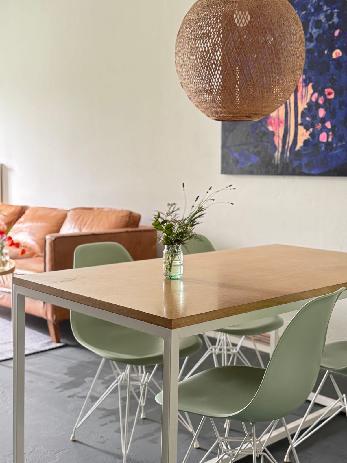 Notre maison jumelée au toit de chaume aménagée avec soin se trouve à Neuendorf-Heide, un petit village sur le Saaler Bodden entre les villes hanséatiques de Rostock et Stralsund. L'ancienne ferme, construite en 1850, offre avec ses 125 m² de surface habitable et 1000 m² de terrain de la place pour 5 personnes. Les 3 étages du chalet et les 3 jardins partagés offrent un espace pour la convivialité, mais aussi des possibilités de retraite pour se détendre. Une journée à la plage se termine avec la joie d'une maison confortable.