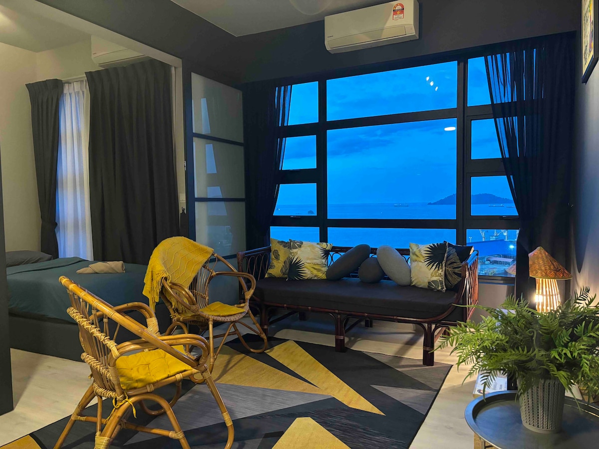 Vue imprenable sur la mer depuis la maison. Détendez-vous sur le balcon. Piscine@niveau 6 Salon, chambre Queen Size, canapé-lit privé avec rideaux. Salle de bain attenante avec douche à eau chaude et eau froide. Grand réfrigérateur avec glaçons, mini cuisine avec cuisinière électrique, casserole, assiette, cuillère, fourchette sont disponibles. Cuisinier léger dans la cuisine. Machine à eau filtrée chaude et tiède. Veuillez sélectionner 3 invités si vous avez besoin d'un lit simple convertible à partir d'un canapé-lit.