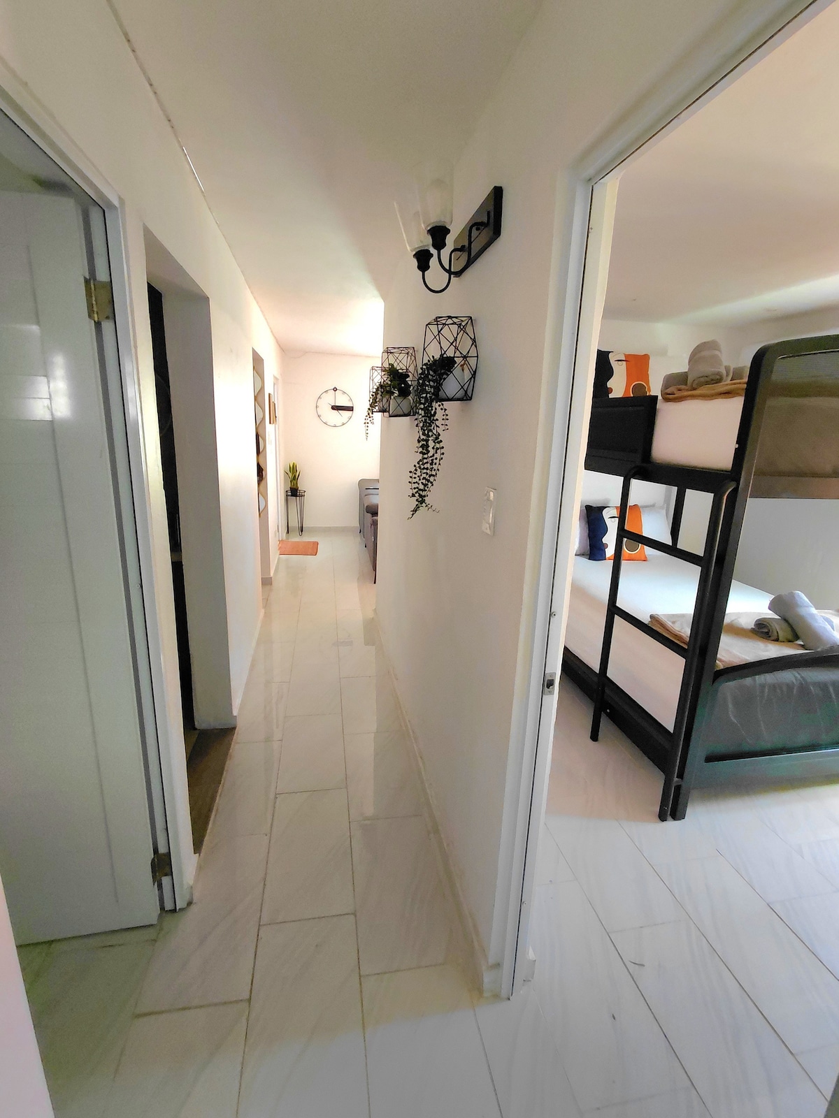bel appartement à seulement 12 minutes de l'aéroport, dispose d'une chambre principale avec air et une autre chambre avec ventilateur de plafond super frais, parfait pour les couples et un autre client, a de l'eau chaude, cuisine équipée avec tout ce dont vous avez besoin, TV et un balcon pour fumer, à proximité des plages sur l'île verte, comté et à seulement 5 minutes de la Plaza Escorial où vous avez des restaurants, Walmart, des magasins et ainsi de suite, l'endroit idéal pour profiter des vacances.
