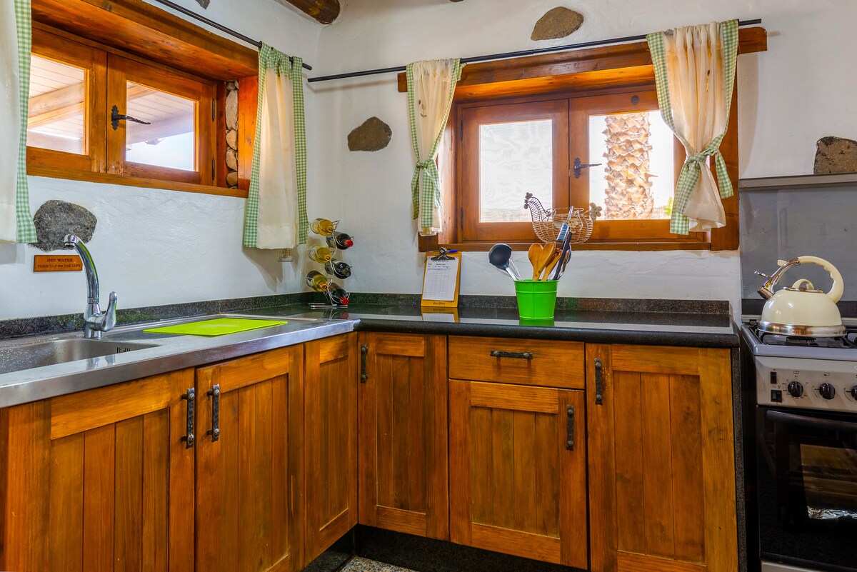 Este espacioso granero convertido de un dormitorio es ideal para quienes disfrutan de estar rodeados de naturaleza. Nuestra casita rústica ha sido renovada para incluir una moderna cocina, sala de estar y comedor con espectaculares vistas al mar y al valle. La propiedad tiene su propia terraza con impresionantes vistas panorámicas del Valle de Orotava y el Océano Atlántico hasta la isla de La Palma. También le ofrecemos el uso compartido de un spa / jacuzzi en la finca.