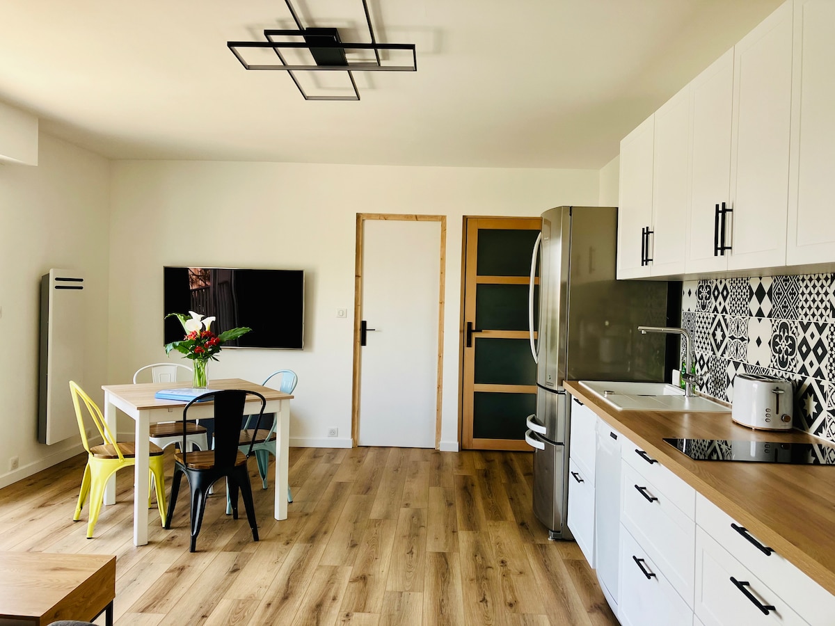 Chambre, salledebain, wc et petit coin cuine. Indépendant, proche centre ville, commerces et mer (accès à pieds, moins de 10 min). Endroit calme, refait à neuf et équipé. Route facile d'accès pour stationnement. Wi-Fi gratuit. Possibilité de fumer à l'extérieur du logement. La cour est commune, avec la maison des propriétaires. Arrivées et départs libres (boîte à clé sécurisée)