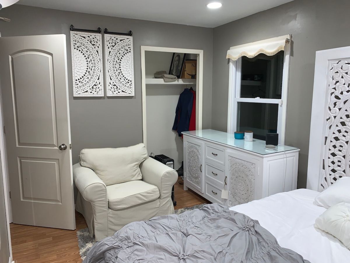 La chambre est soignée et propre, dispose d'un placard, d'un petit réfrigérateur, d'un bureau et de 2 fenêtres qui laissent entrer beaucoup de lumière naturelle. Le lit est de taille Queen. La salle de bains est partagée. Petite kitchenette partagée pour une cuisine rapide et légère à l'aide d'une cuisinière ou d'un micro-ondes ; l'utilisation du grand four n'est pas partagée. Non fumeur et aucun animaux.