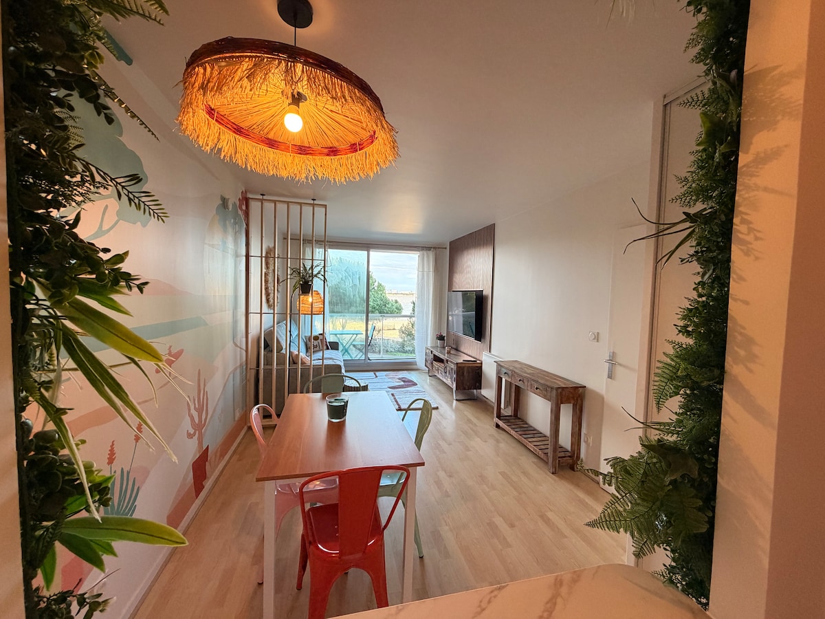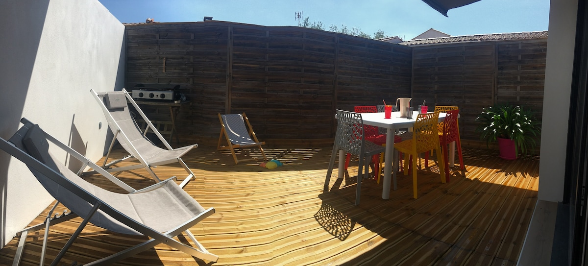 Ce Loft en duplex de 30m² (5min à pied de la plage), est fait et pensé pour un séjour bien-être à 2. Un véritable jacuzzi privatif, une salle de massage, lit queen size avec vue sur les étoiles et un jardin privé de 25m². Quartier très calme. Très Cosy, ce duplex est très bien équipé : cuisine aménagée, coupes à champagne, tout pour diner et petit déjeuner, micro-ondes, nespresso, canapé, tv connectée, leds, wifi, enceinte assistant vocal, spotify, wc séparé, douche, sèche serv, ext intimiste.