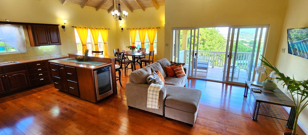 Nous sommes perchés au sommet d'une colline avec une vue magnifique sur la mer des Caraïbes et la capitale, St. Johns. L'appartement se situe à 10 minutes de l'aéroport, du centre-ville de St. Johns et de la plage, il est donc très bien situé. L'appartement dispose de sa propre entrée pour que vous ayez de l'intimité. Une bouteille de notre punch au rhum maison vous attend à votre arrivée ! Le petit-déjeuner peut être commandé. Il suffit de demander ! Tous les types de personnes sont les bienvenus. :-)