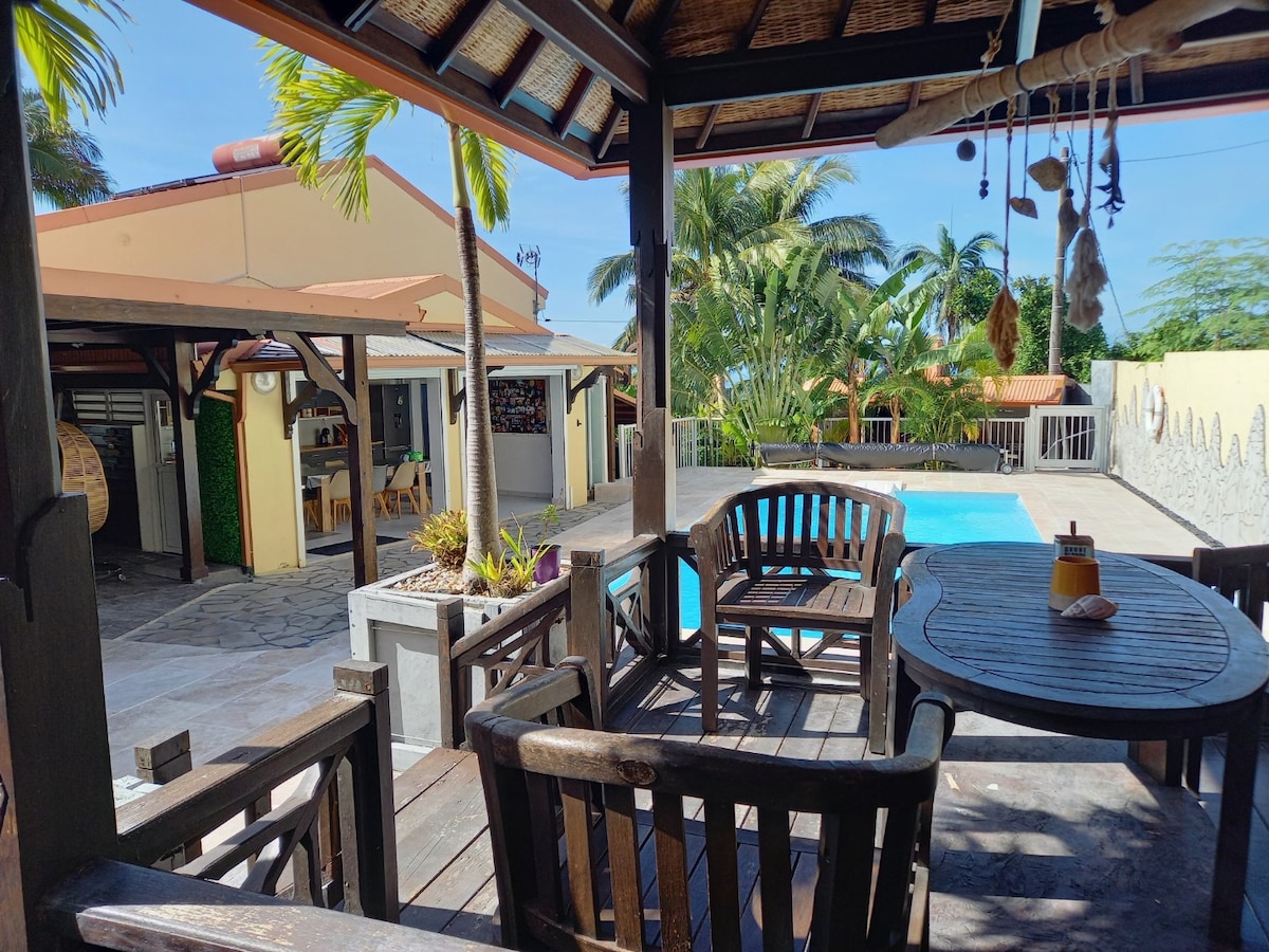 Cette maison, nous l'adorons! Une petite case centenaire en bois de fer... Un jardin luxuriant débordant de plantes tropicales... Deux varangues et une terrasse avec brasero... Un aménagement soigné... À côté, le Cap Méchant pour des sunsets fabuleux, et l'incroyable piscine littorale du Baril... Deux salles de bains à ciel ouvert, avec douche ou baignoire... et le soir, si vous le souhaitez, les repas succulents de Nathalie livrés à votre table... Vous serez heureux chez Mamie Méchant!