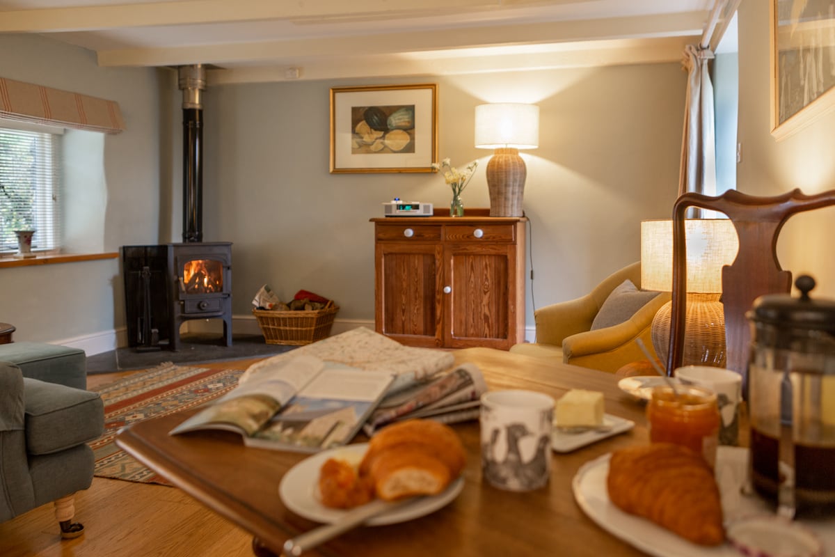 Offres spéciales tout au long de janvier/février 2026 : veuillez vous renseigner ou le mentionner lors de l'envoi de votre demande de réservation. Maison de vacances paisible et confortable à aire ouverte dans une vallée boisée abritée. Cuisine entièrement équipée avec lave-vaisselle, lave-linge et sèche-linge, plus WC au rez-de-chaussée. Salle de bain à l'étage et 3 chambres (2 doubles et 1 lit superposé double de 4 pieds avec lit simple au-dessus). Patio ensoleillé avec barbecue à côté d'un ruisseau. Parking gratuit. Promenades hors route jusqu'à la plage (4 min en voiture/20-25 min à pied), 8 min en voiture jusqu'au port, promenade jusqu'au pub du village.