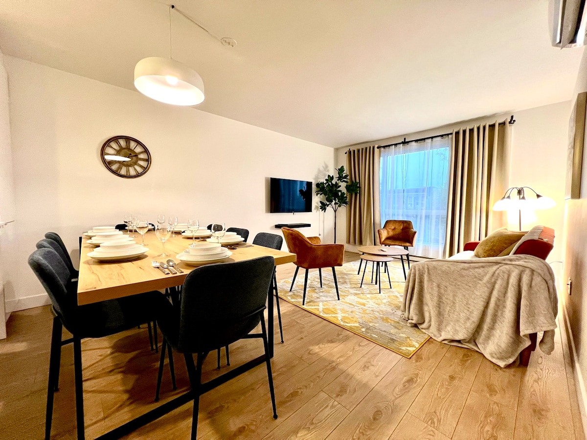 Bienvenue dans votre appartement élégant et ensoleillé, situé dans une rue paisible avec vue sur le parc. Cet espace récemment rénové comprend des draps et serviettes de haute qualité, une cuisine entièrement équipée, et un canapé moelleux avec une TV 4K de 55" pour vos moments de détente. Profitez d'un accès facile aux autoroutes et de places de stationnement. Commencez vos matinées sur l'une des deux patios accueillants. Découvrez le parfait mélange de confort et de style.