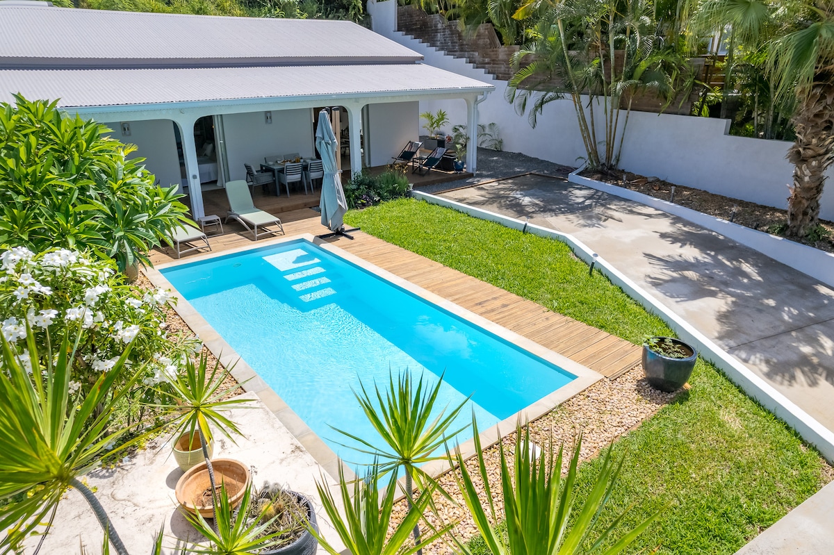 Adresse d’exception à Grand Fond (Saint-Gilles-les-Bains). Villa de 3 chambres avec piscine à débordement et spa. Son grand salon ouvre plein cadre sur l’océan et les montagnes ; on vit autant dedans que dehors : cuisine extérieure équipée, salon d’été, terrasse couverte, brasero, douche extérieure en pierre naturelle, jardin tropical et pelouse douce type “golf” avec éclairage nocturne. À quelques minutes des plages et spots de l’Ouest (Boucan Canot, Roches Noires, Les Brisants), restaurants,