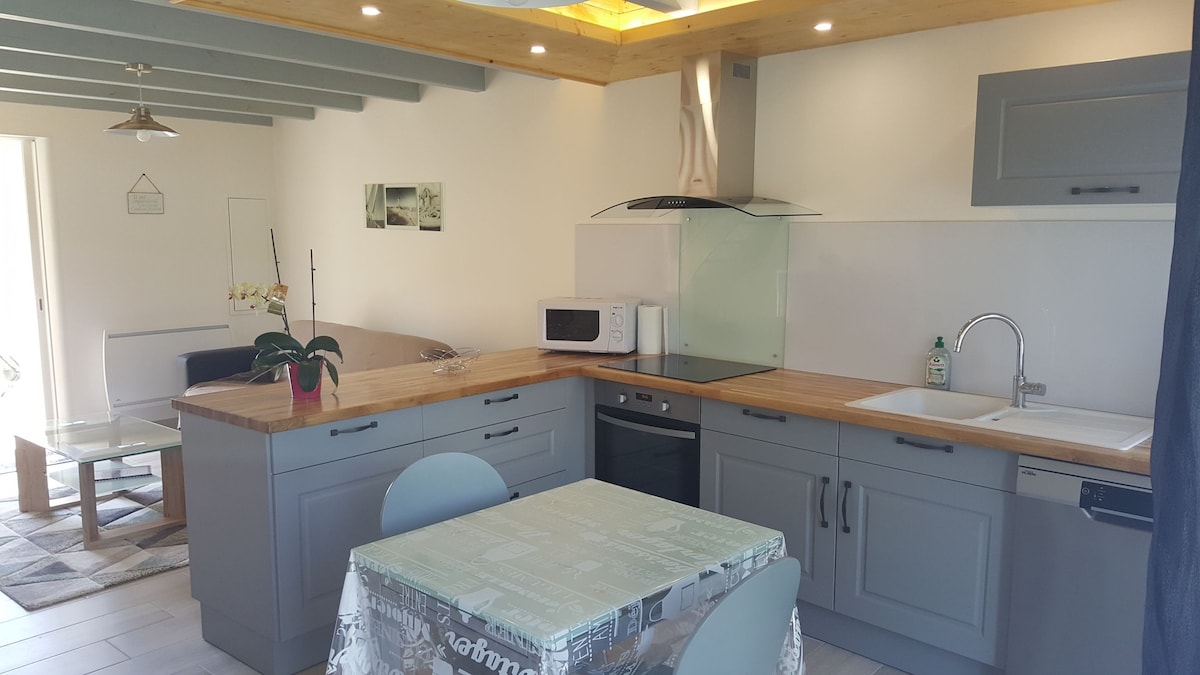 Gîte "La grange" neuf de 35 m² douillet, tout équipé, sur un joli petit jardin clos ou vous pouvez vous reposer au calme, aucun vis à vis et à 5 min de Jonzac. Vous y trouverez tous les commerces, idéal curistes (cure à 7 min) Casino, parc aquatique "les Antilles" , le palais des congrès et base de loisirs. "Le gîte est pour 2 adultes, et le canapé utilisable exclusivement pour 2 enfants SVP . ."Tarif spécial curistes : 850 à 900 €/3 semaines selon période. (pas l'été)
