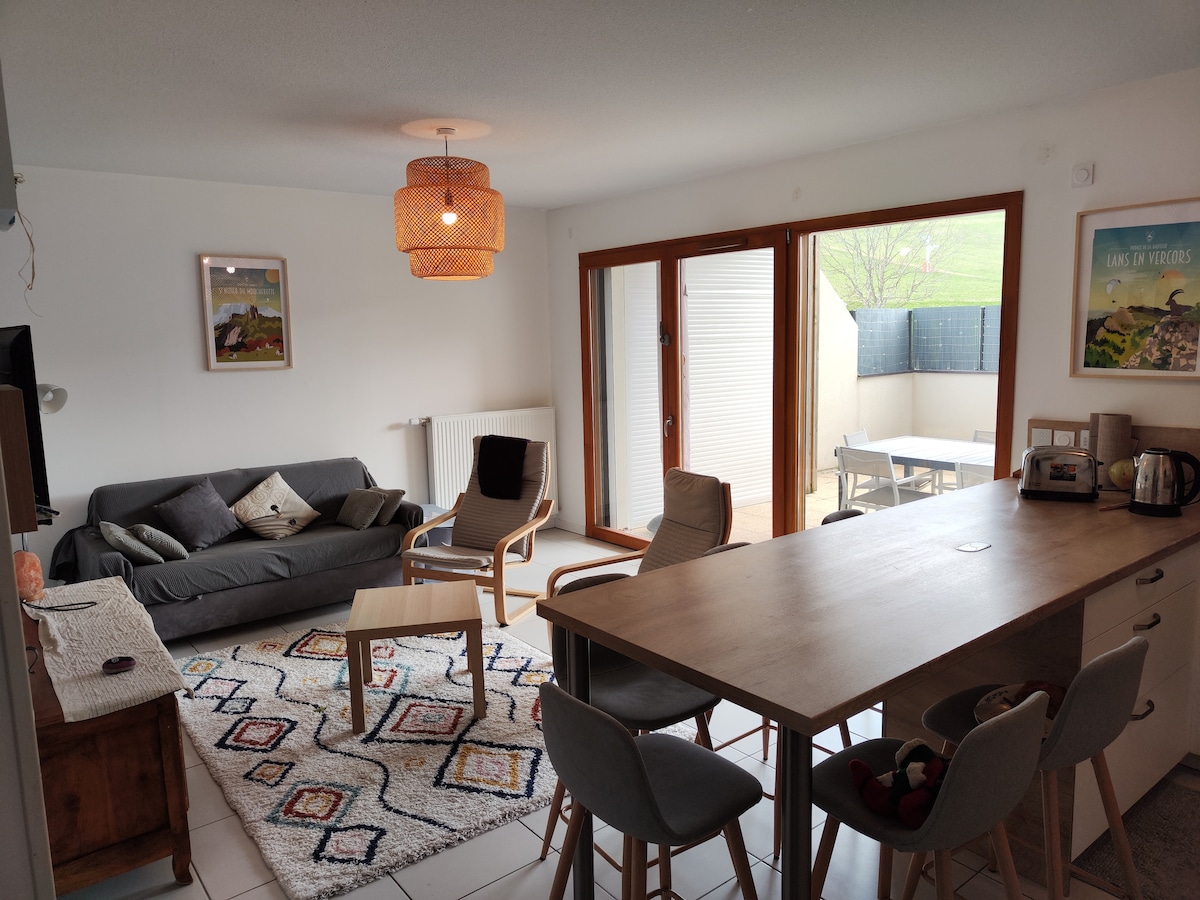 Dans le parc du Vercors à 20mn de Grenoble et d'une station de ski. Nombreuses balades à pied autour avec vue exceptionnelle. Appartement 35m2 + 7m2 de style nordique avec une terrasse de 25m2, 1 entrée indépendante de 7m2 au RDC, 1 cuisine ouverte tout équipée avec salon (possibilité de 2 couchages supplémentaires), 1 chambre avec lit double, 1 salle de bain avec douche et double vasques, 1 toilettes indépendantes. Linges de lits et serviettes de toilettes non fournis. 140x190 + 80x190.