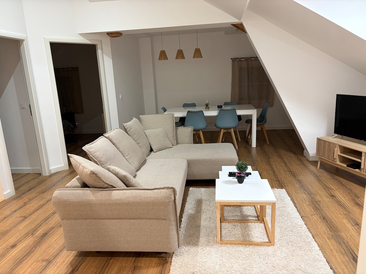 Cet appartement au cœur de la Roche-sur-Foron *** refait à neuf en 2021, proche Gare et RocheExpo *** est situé au carrefour de la Haute-Savoie et du Grand Genève. Ce logement est lumineux, moderne, fonctionnel et propose des équipements de qualité. Il dispose d'une grande chambre séparée avec un lit double et un dressing. Grand séjour -salon cuisine- plus un canapé lit offrant un véritable couchage en 160X200, une salle d’eau avec douche à l'italienne et WC, un écran plat (TNT) et la WIFI.
