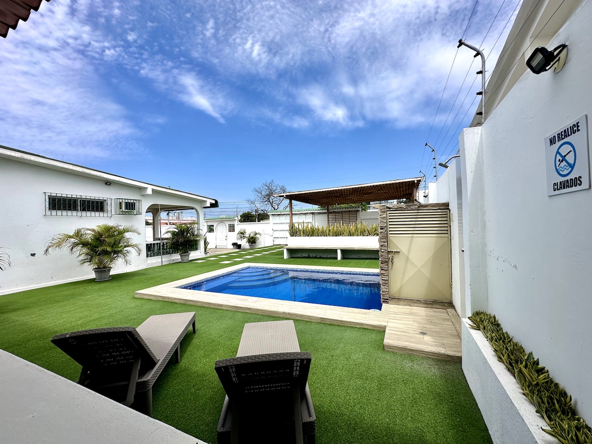 Venez profiter de vacances reposantes avec votre famille et vos amis, dans une grande maison de plage, belle et bien située. À seulement 3,7 kilomètres (5 minutes !) en voiture du magnifique Malecón de Salinas et Chipipe. Nous vous offrons tout ce dont vous avez besoin pour une escapade amusante et relaxante... et si vous avez besoin de plus de fournitures, vous êtes à seulement une minute à pied du Supermaxi. Encouragez-vous et réservez votre séjour aujourd'hui !