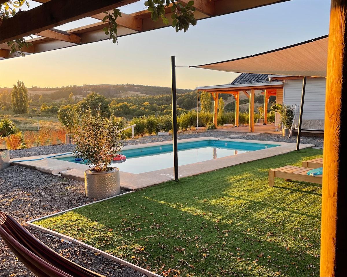 Détends-toi un peu. À 10 minutes de Los Angeles sur le chemin de Cerro Colorado km 12. Reposez-vous dans une maison lumineuse et confortable, parfaite pour les familles ou les groupes. Profitez d'une grande terrasse, d'un espace barbecue idéal pour les grillades et d'une piscine privée pour vous détendre au soleil. Environnements confortables, cuisine équipée et un environnement calme pour déconnecter. Tout a été pensé pour que vous arriviez, que vous profitiez et que vous ne vouliez pas partir.