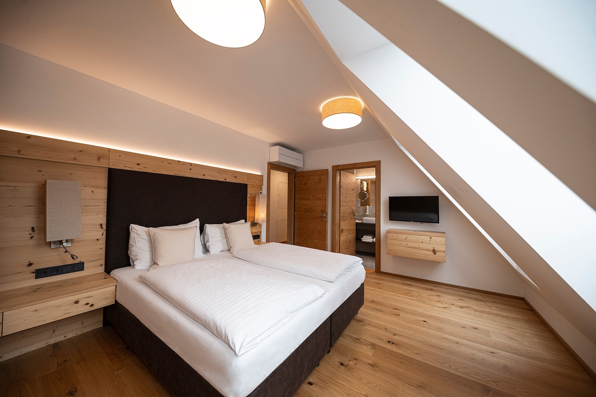 La suite Comfort est située au 1er étage de notre VILLA ELISA (construite en 1906) récemment rénovée ; elle est idéale pour 2 à 6 personnes et est facilement accessible par ascenseur. Il se compose d'une chambre avec 1 lit double et 1 lit simple, d'une salle de bain avec douche, lavabo et WC lavant modernes, et d'un séjour/salle à manger avec table et canapé fonctionnel. 3 personnes supplémentaires peuvent dormir confortablement dans 1 lit double escamotable et 1 lit simple.