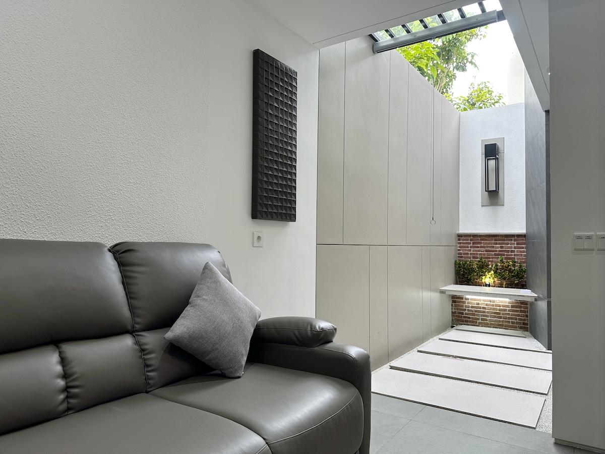 Amenez votre famille dans cette maison astucieuse avec beaucoup d'espace. Profitez de beaux jardins design, ornés de plantes locales et d'une vue luxuriante sur les terres agricoles. Soyez en paix tout en étant à 10 minutes du centre commercial exclusif : Pakuwon Mall. Excellent accès à toutes les destinations de Surabaya, y compris 30 min du centre-ville et 45 min de l'aéroport. Parfait pour des vacances en famille, des séjours de longue durée, des séjours de travail à domicile et bien plus encore. Conçu par la designer 5 étoiles Angela Kong avec plus de 100 commentaires positifs.