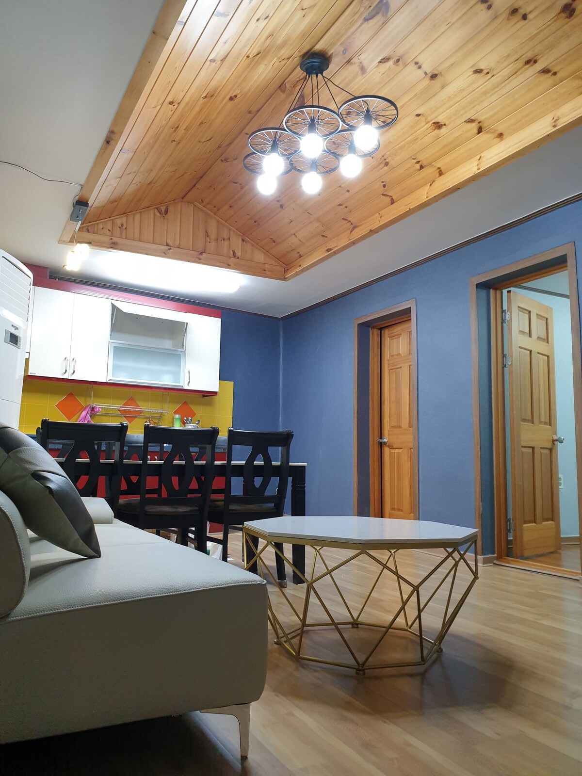 Il s'agit d'une pension de colline venteuse située au sommet de la colline venteuse, qui est une jolie route non dorée et émotionnelle avec le phare de Mukho à Donghae-si. Il y a une vaste mer devant vous, et vous avez la meilleure vue sur l'océan où vous pouvez profiter d'un lever de soleil fantastique même en vous allongeant. Vous pouvez visiter le marché aux poissons du port de Mukho, où vous pourrez déguster des sashimis frais, et Dochjaebi Golf Sky Valley et l'observatoire Hae Rang, ainsi que la mer de l'Est principale à 5-10 minutes en voiture. Plage de Mangsang, grotte dorée, vallée de Mureung et Chuwam, route sensorielle de Hanseom Il est situé à proximité En famille, en amoureux et entre amis, dans la cour avant, vous pourrez profiter du coucher de soleil, de la Lune bleue, de la Grande vague, Vous pourrez également profiter de différents types de bière super fraîche, de bière artisanale locale, de collations signature avec du vin soigneusement sélectionné et de poulpe Mukho, de quesadilla, de gambas, de soupe aux palourdes, de planche de jambon et de crackers, et de barbecue. Veuillez nous envoyer un message à l'avance car le prix sera ajouté en fonction du nombre de personnes lors de l'utilisation du barbecue.