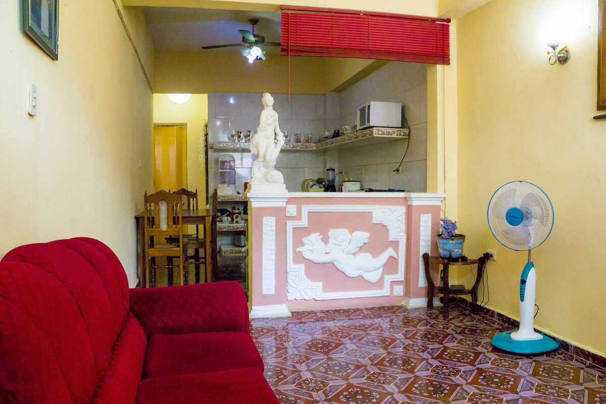 Appartement lumineux et bien ventilé au cœur de Santa Clara ; à seulement 1 pâté de maisons du Parque Vidal. Situé au 1er étage ; pas d'ascenseur disponible. Propre et avec des services optionnels qui comprennent les transferts, le service de petit-déjeuner et les visites guidées. Nous souhaitons que vous profitiez de notre ville et que vous passiez un agréable séjour avec une attention personnalisée. Wi-Fi. Pas de Black Out.