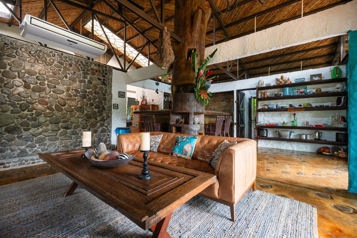 Maison privée. 3 chambres, 2 salles de bains complètes, eau CHAUDE. Cuisine, salle à manger, salon. Allée et parking privés. Climatisation. Porche. WIFI puissant. Peintures d'un artiste local. Nichée dans un sanctuaire naturel privé. Des grenouilles ! Blue-jean, Red-eyed, Gaudy. Ara rouge. Toucans. Asseyez-vous sur le quai du lagon, faites une promenade paisible sur les nombreux sentiers de ruisseau, faites une randonnée nocturne passionnante ou demandez à Maricel de vous enseigner les plantes médicinales. Arrêt parfait de San José à La Fortuna 702.
