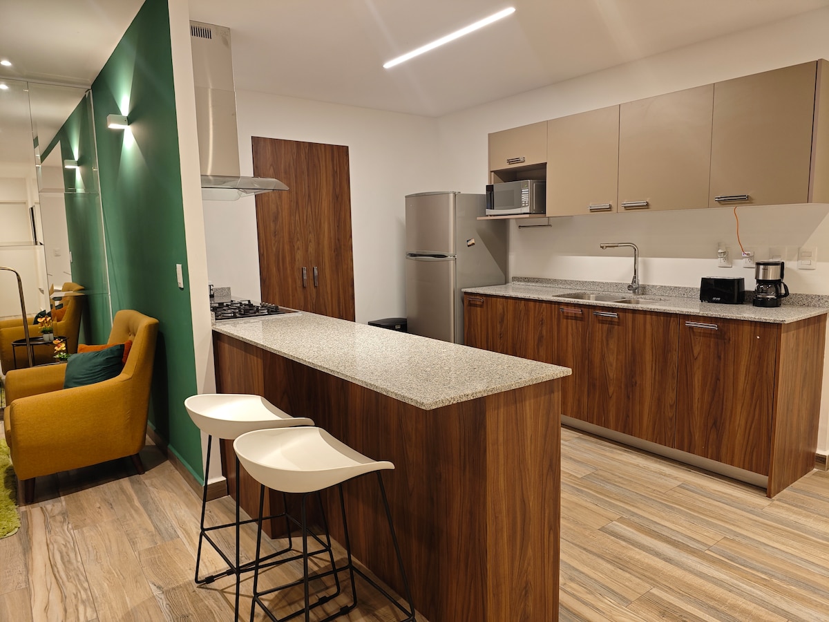Découvrez les vues les plus impressionnantes de Querétaro ! depuis cet appartement moderne de style industriel. À seulement 10 minutes du centre, profitez d'une vue imprenable sur la ville et la montagne. Parfait pour les groupes jusqu'à 3 personnes, il offre un espace confortable et fonctionnel qui allie confort et style. Il est idéal pour les voyages d'affaires ou de loisirs en raison de l'accès facile, des commerces et de la possibilité de facturer votre séjour. Découvrez le confort que cet appartement vous offre.