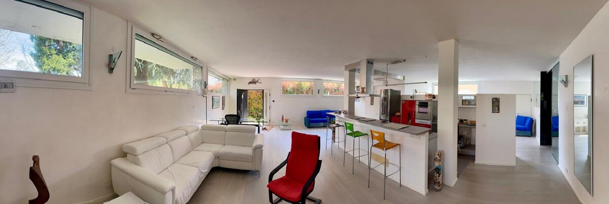 Ce loft spacieux au design élégant et avec vue sur le jardin est une rareté dans le centre historique de Venise. Le bâtiment est la conversion élégante d'une ancienne centrale de chauffage reconçue par des architectes en espace de vie en 2010. Dans une petite rue calme, mais à quelques minutes à pied des gares/stations de bus, du Grand Canal, du supermarché, des restaurants et des magasins. Idéal pour explorer la ville de 1 600 ans à pied, sans renoncer au niveau de vie auquel vous êtes habitué aujourd'hui, y compris une connexion Wi-Fi haut débit, un ascenseur et un bain de vapeur.