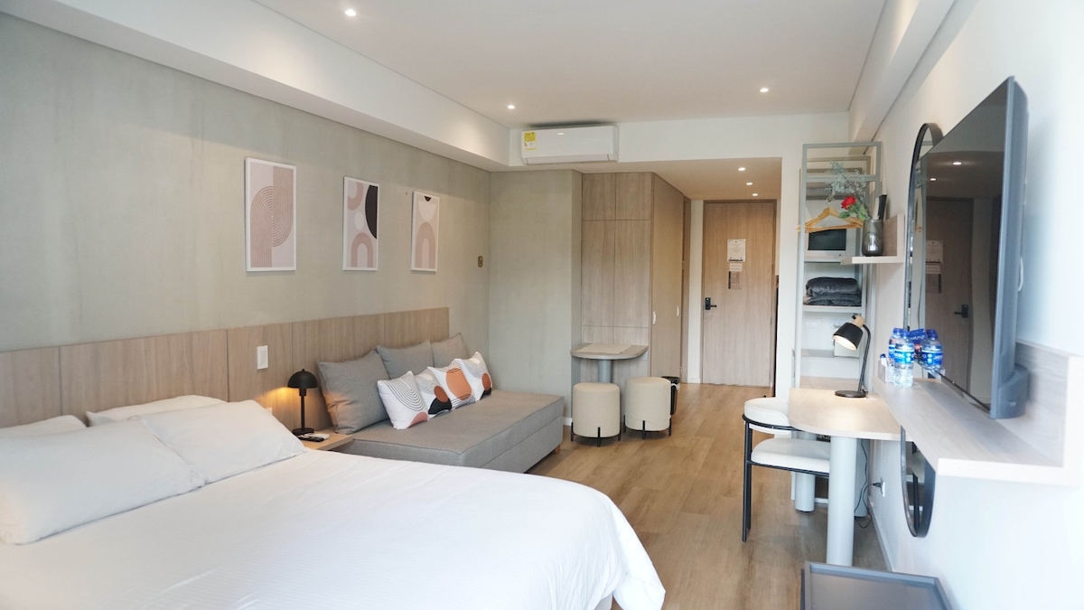Élégant appartement d'une chambre au cœur de La 70 et à 5 minutes à pied de la région de Laureles. Profitez d'un espace confortable avec balcon, cuisine équipée, climatisation, Wi-Fi rapide, blanchisserie gratuite et arrivée autonome avec codes numériques. Travaillez à distance avec un accès à un espace de coworking à l'intérieur du bâtiment. À quelques pas des meilleurs restaurants, cafés, métro et vie locale. Personnel d'assistance sur place 24h/24. Conçus avec soin pour favoriser le confort, la créativité et les échanges avec la ville.