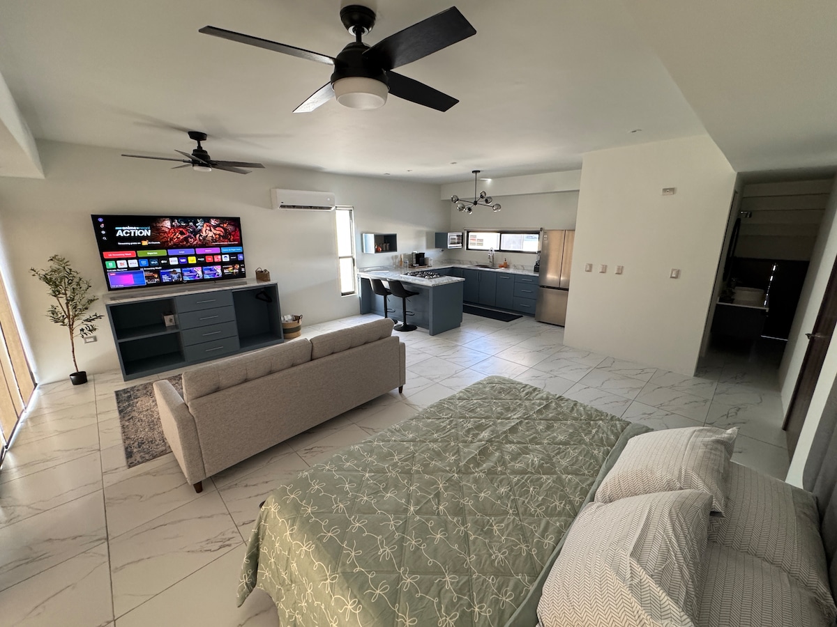 "The Apartment" es un espacio anexo en una casa en fraccionamiento privado, equipado con todo lo necesario, una gran recamara con cama matrimonial con entrada de luz natural pero no incandescente, perfecta para descansar y ver peliculas en la Smart Tv, tiene su baño privado y un closet vestidor, tambien esta su area para trabajar o disfrutar de una cena, The Department es muy acojedor y perfecto para cualquier ocasión.