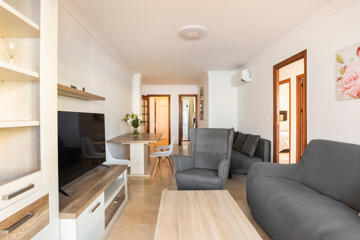 Welcome to Anna del Mar – your stylish boho escape in the heart of San Luis de Sabinillas! • Only 500 meters from Costa del Sol beach • King bed + King sofa bed (sleeps 4) • A/C + 55" Smart TV with Netflix • Fast WiFi + dedicated workspace • Kitchen with dishwasher & washing machine • Easy self check-in anytime • Private underground parking included • Spacious balcony with park views • Baby-friendly amenities • Steps to lively bars, shops & kids’ park
