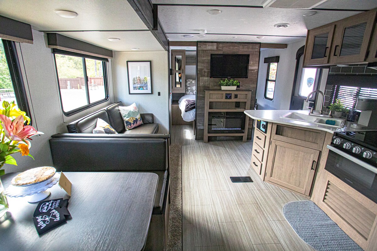 Toute nouvelle remorque de voyage de 27 pieds disponible à Paso Robles, située dans un parc de camping-cars de luxe. FRAIS DE RÉSERVATION DE CAMPING NON INCLUS DANS LE PRIX DE LA CARAVANE ! VEUILLEZ CONTACTER L'HÔTE POUR PLUS D'INFORMATIONS. Il y a 5 lits dont une chambre principale avec un lit Queen Size, 2 lits superposés complets, un canapé convertible et un lit de salle à manger. La caravane de voyage dispose de tous les raccordements avec climatisation, chauffage, cuisine complète, éclairage extérieur et système audio Bluetooth avec haut-parleurs intérieurs/extérieurs. Ce logement mémorable est tout sauf ordinaire.