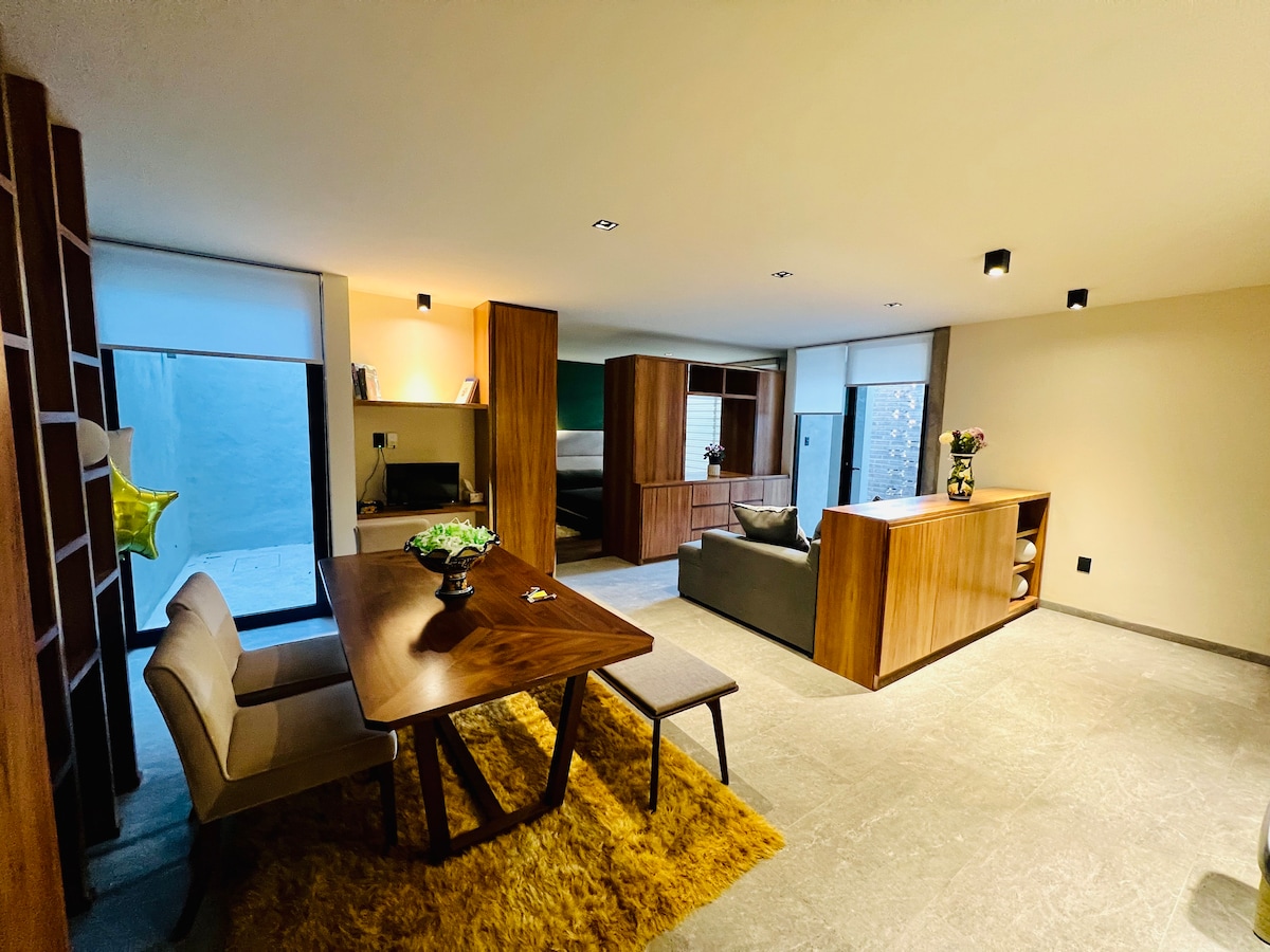 Détendez-vous dans ce loft calme, élégant et spacieux, au rez-de-chaussée, garage avec porte électrique, serrure numérique, entrée indépendante, lit queen confortable, grand placard, grande salle de bains, canapé-lit, écran 55”, cuisine entièrement équipée, réfrigérateur, airfryer, etc. Et pour travailler, Internet haut débit et un grand bureau. À quelques pas d'Oxxo et Brotgarten. À 2 pâtés de maisons à pied de l'avenue. Carranza, à environ 4 pâtés de maisons de nombreuses options : « tacos el pata », Vips, B. De Obregón, église, Starbucks, salle de sport.
