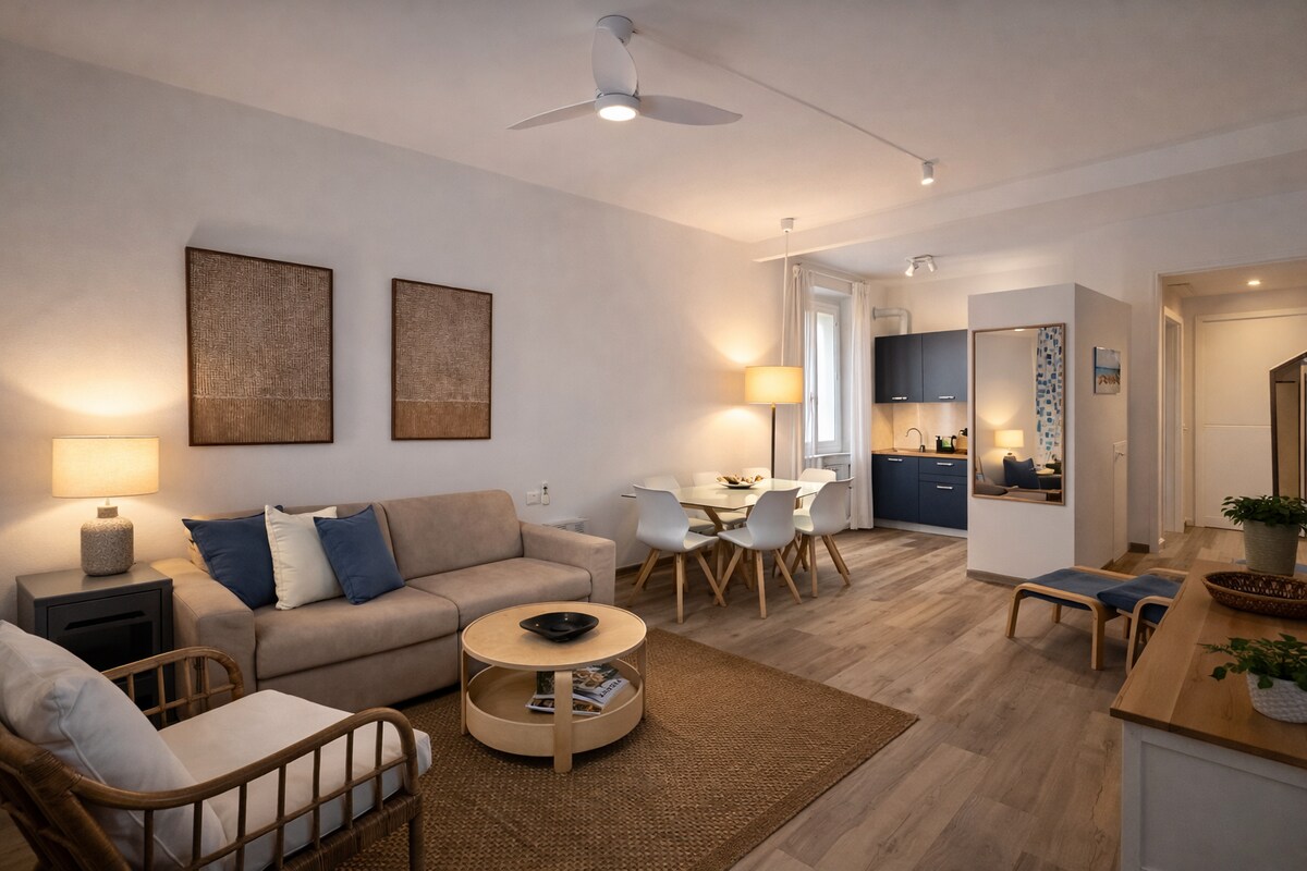 Appartement neuf au coeur du centre historique, calme, facilement accessible, sûr. A quelques mètres de la Piazza Dante des parkings et du métro (2 minutes à pied), à l'extérieur de la maison il y a de nombreux restaurants et magasins et tous les plus beaux endroits de Gênes. Deux chambres doubles (lits doubles) et deux salles de bains (l'une des deux avec seulement toilettes et lavabo), salon avec cuisine ouverte, climatisation et wifi. Premier étage sans ascenseur (environ 10 marches).