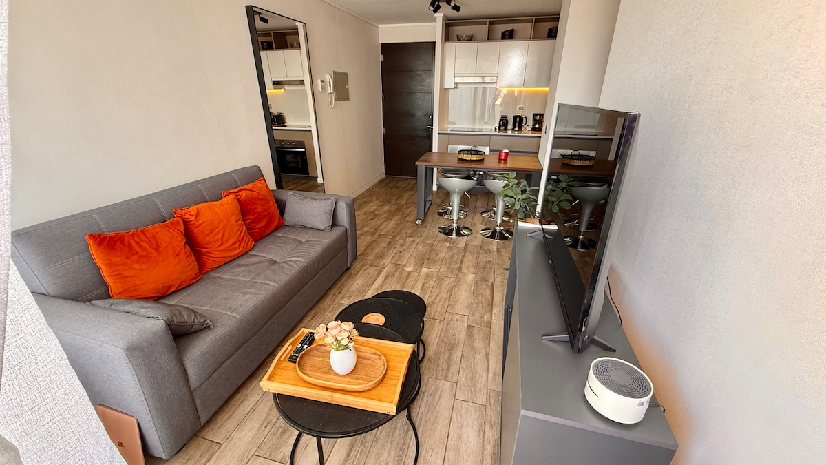 Appartement confortable et lumineux avec balcon, équipé d'un lit queen size et d'un futon pour un troisième invité. Cuisine entièrement équipée Wi-Fi 500 Mbps Smart TV Consigne à bagages gratuite Animaux acceptés À seulement 3 minutes du métro départemental, des supermarchés, des restaurants et des cafés à quelques pas. Autoroute centrale à seulement 5 min. Profitez d'une salle de sport, de quinchos et d'une laverie en libre-service dans un immeuble résidentiel sécurisé avec conciergerie 24 h/24 et 7 j/7. Idéal pour les couples et les longs séjours. Réserve et vis Santiago comme chez toi !