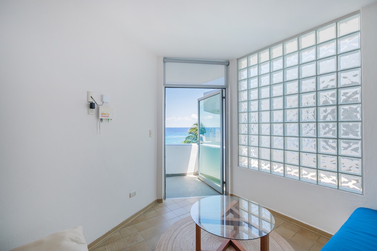 Wake up to the Caribbean Sea. From your private balcony at Suites Turquesa, you'll see why Cozumel is home to the world's second-largest coral reef. Your ocean view suite sits directly on the water — grab your snorkel mask and step in from our shore, no boat needed. The suite: 59 m² of comfortable, well-equipped space. King-size bed, kitchenette (coffee maker, toaster, pots, pans, full utensil set), TV, A/C, and not one but two balconies facing the turquoise Caribbean.