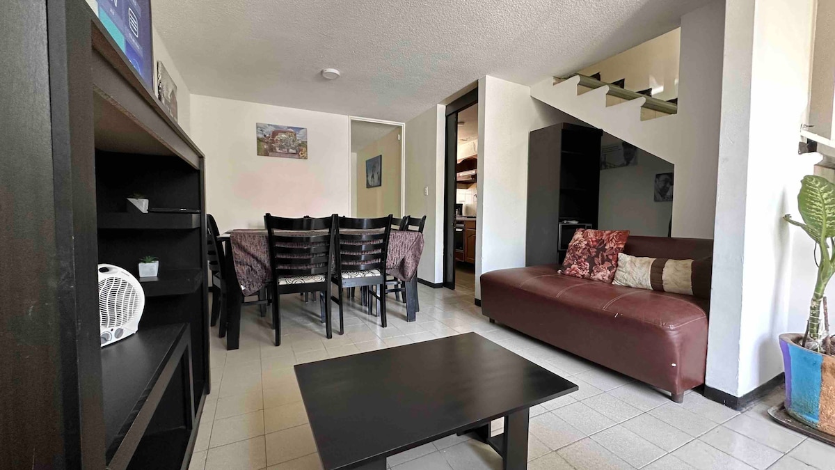 Profitez d'un séjour incroyable dans cette maison lumineuse, fraîche et super confortable. Il dispose d'un joli jardin pour se détendre ou pour vos animaux de compagnie, d'une connexion Wi-Fi rapide pour le travail et d'une cuisine entièrement équipée pour que vous puissiez cuisiner facilement. Situé à quelques pas du centre commercial Explanada et à proximité du Periférico, se déplacer est super facile. Nos précédents voyageurs le recommandent vivement.