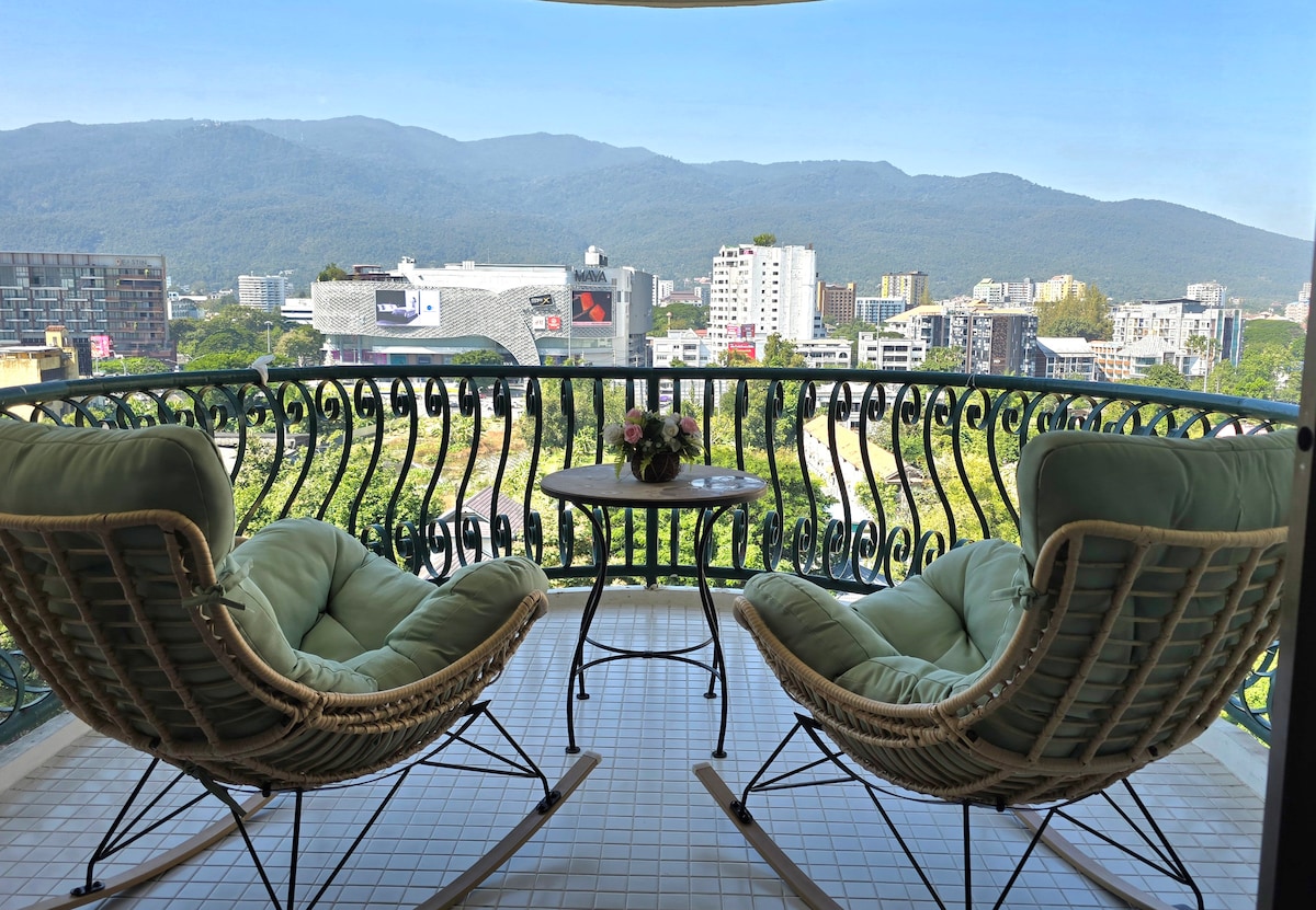 Grand balcon avec vue sur le centre-ville, appartement hôtelier