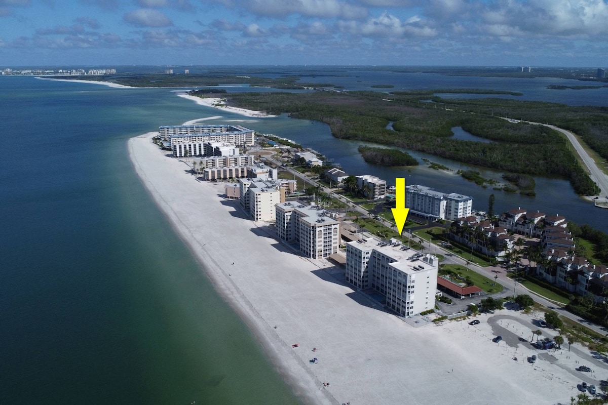 Notre magnifique appartement d'une chambre est situé directement sur une plage privée de sable blanc avec de belles vues sur le golfe et la baie depuis un balcon privé. Équipements modernes et nouveau mobilier, y compris deux téléviseurs intelligents à écran plat 40". Profitez de la piscine chauffée, des grils à gaz et de notre plage peu fréquentée, avec la belle plage du parc d'État de Lovers Key directement reliée à la nôtre. Accès facile aux magasins, aux restaurants et au tramway. Il y a beaucoup d'activités/sports nautiques ici ou simplement se détendre. Gardez un œil sur les dauphins !