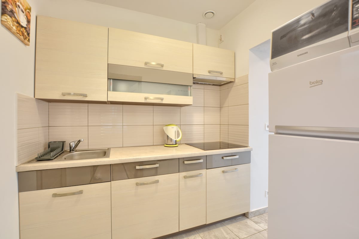 L'appartement se compose de deux chambres (l'une avec lit double, l'autre avec deux lits simples), d'un salon avec un coin salon (le canapé dans le salon n'est pas convertible) et une sortie vers le balcon, d'une cuisine entièrement équipée (machine à laver, réfrigérateur, lave-vaisselle, cuisinière à gaz, micro-ondes), d'une salle de bain avec douche et d'un grand couloir dans lequel se trouve une penderie spacieuse. L'appartement est récemment rénové, situé au premier étage d'un bloc de quatre étages.