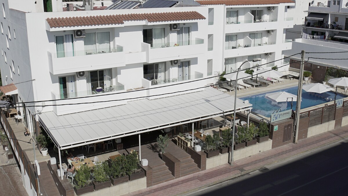 L'Aparthotel Fleming 50 -Adults Only-,inscrit au registre des établissements d'hébergement touristique du Consell Insular D'Eivissa Nº APM-1918, est un ensemble de 20 appartements qui se trouve à seulement 5 minutes de la plage et à moins de 10 minutes à pied du centre de San Antonio. Il dispose d'un bar-restaurant, d'une piscine, d'un chill out, d'un parking, de la climatisation et d'une connexion Wi-Fi gratuite dans les appartements. Appartement de deux chambres avec deux lits simples dans chacune et un canapé-lit.