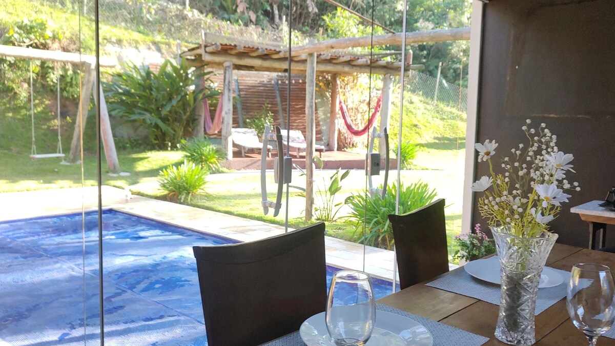 PISCINE CHAUFFÉE, eau chaude toute l'année. Chácara l confortable entouré de beaucoup de nature. Idéal pour ceux qui recherchent un endroit calme pour récupérer l'énergie . Logement confortable avec 2 chambres, dont l'une dispose de la climatisation et d'une télévision connectée. La mairie ne permet pas le son, la propriété privée de 03 fermes mais tout privé, partagé seulement le portail principal, ont d'autres portes intérieures. Nous ne servons pas les groupes qui veulent passer la nuit éveillée . Arrivée vendredi à 18 h.