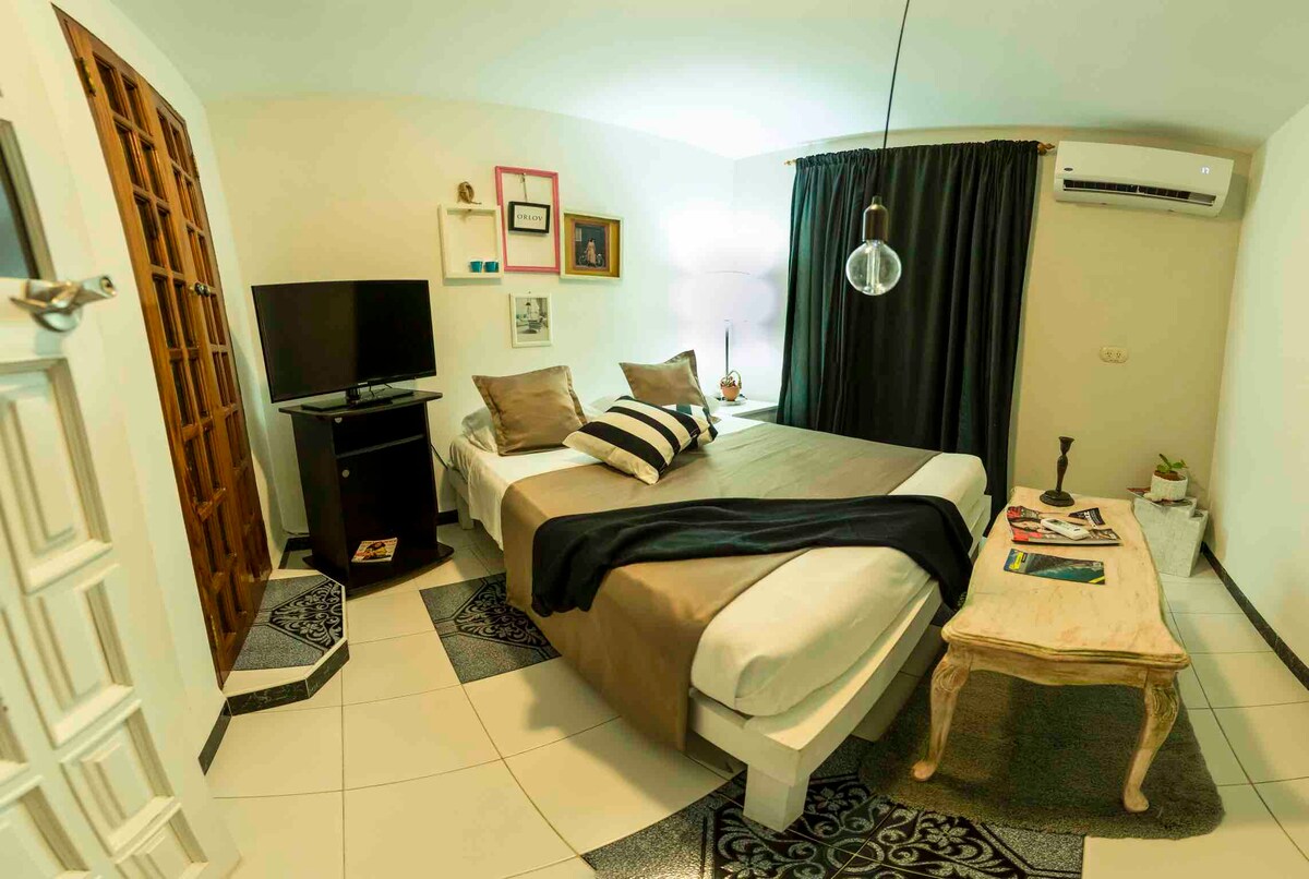 C'est un appartement indépendant spacieux. Avec une chambre avec deux lits, (un grand et un plus petit), la climatisation, un coffre-fort, des cintres pour les vêtements et une télévision. Une salle de bain avec eau chaude et froide ; cuisine équipée avec tout pour la préparation des aliments (micro-ondes, cafetière, grille-pain, casseroles, cuisinière à gaz, réfrigérateur), une petite table pliante et trois tabourets pour manger, utilisation de la machine à laver. Une terrasse commune entourée de plantes avec des fauteuils, une table et des chaises et un beau jardin.