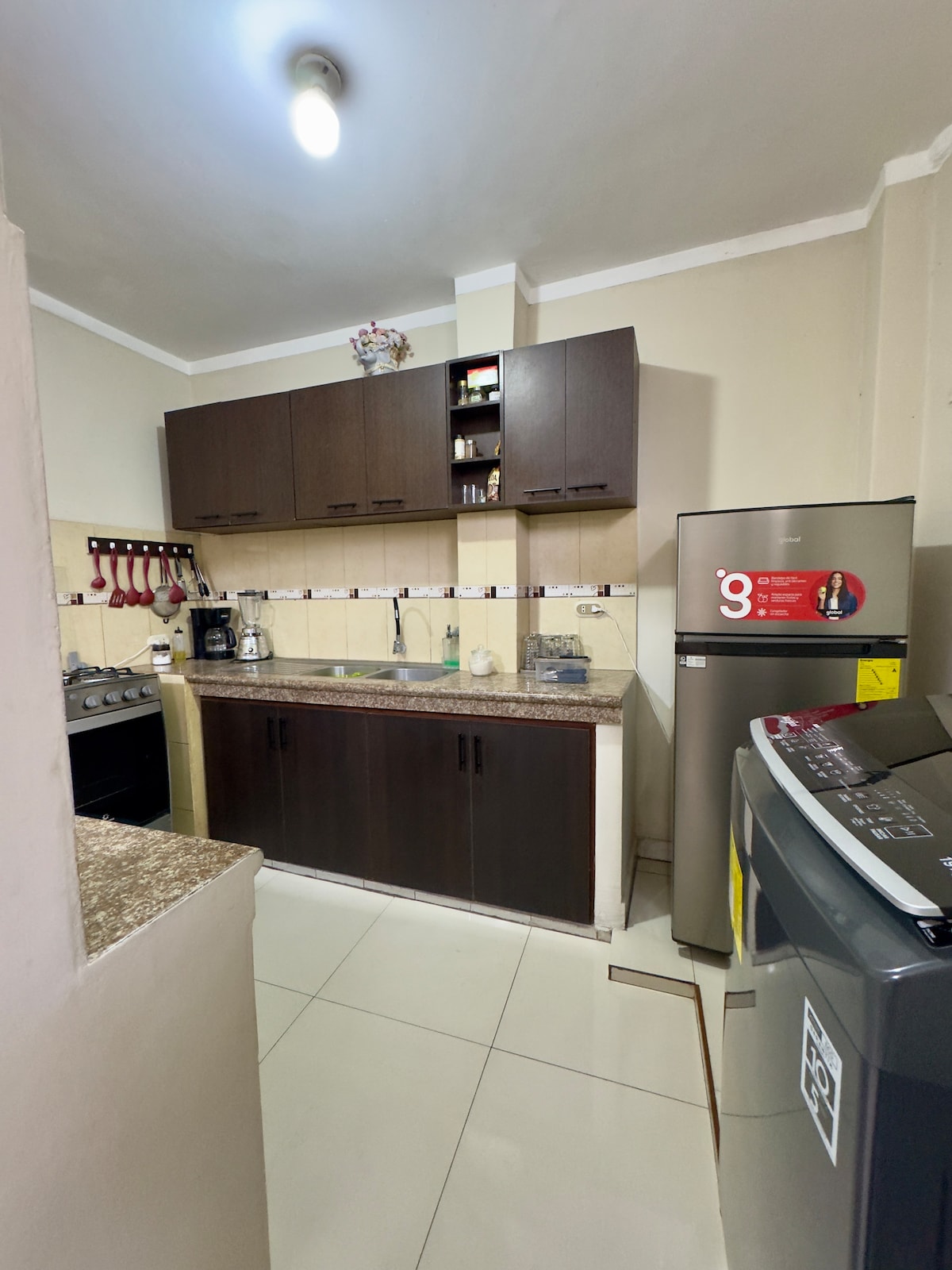 Una suite privada con dos habitaciones independientes, aire acondicionado y smart TV en una habitación y ventilador en la otra habitación, baño privado que comparten ambas habitaciones, cocina con mesón de granito utensilios de cocina y mini nevera. Te vas a sentir como en casa 🥰❤. Escríbeme por interno para coordinar tu llegada. Económico la noche.