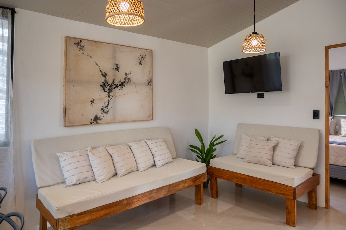 Villa Sereno est une belle casita confortable nichée au cœur de Santa Teresa North qui offre une cuisine entièrement équipée, une chambre spacieuse avec lit King Size et une terrasse spacieuse ombragée avec table à manger et canapé lounge. L'endroit a une atmosphère très confortable et conviviale offrant une expérience unique à nos voyageurs. Installée dans un jardin tropical luxuriant, la villa est également à quelques pas de l'accès à la plage et des services tels que les marchés, les restaurants, les cafés, les boutiques, les studios de yoga/pilates, les distributeurs automatiques de billets, etc.
