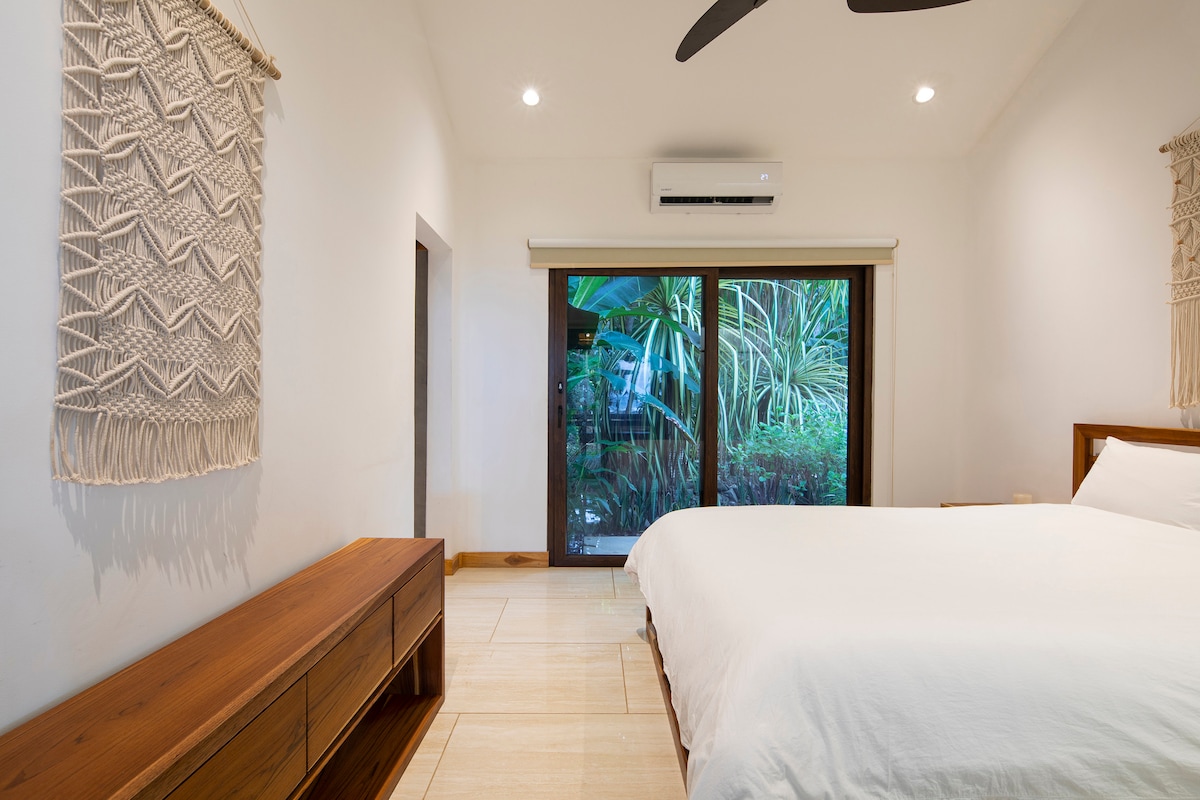 Bienvenue à Indigo Yoga Resort, un endroit vraiment unique situé à Mal Pais. Entouré par la nature, avec belle piscine, spa, shala de yoga, à 200 mètres de la plage et à 5' en voiture de Santa Teresa & Playa Carmen. La maison Ylang dispose de 2 chambres séparées, l'une avec un lit Queen Size et l'autre avec deux lits simples. Cuisine, Wi-Fi, climatisation, ventilateur de toit, porche avec vue sur le jardin et coffre-fort. Salle de bains privée en plein air avec eau chaude. Peut accueillir jusqu' à 4 personnes.