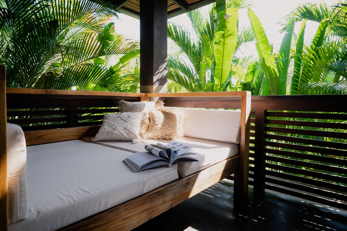 Bienvenue à Sky Above, un appartement lumineux et relaxant sur un parcours de golf de 9 trous dans une résidence sécurisée. À seulement 11 minutes à pied de la plage de Tambor, où vous pourrez participer à la remise à l'eau des tortues de mer. Profitez de plafonds de 18 pieds, d'un lit King Size, d'une cuisine, d'une table à manger, d'un canapé confortable, d'un lave-linge/sèche-linge et d'un bureau d'art/jeu. Observez les aras rouges, les singes hurleurs et les cerfs depuis votre terrasse privée. Les terrains de pickleball sont à 5 minutes à pied, ainsi que l'euchre, le beach-volley, le yoga et le Pilates.